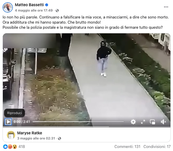 Matteo Bassetti ha reagito in tempo reale alla diffusione del video, pubblicando un messaggio netto sulle sue pagine social: «Sono vivo – ha scritto – Non so più cosa dire. Continuano a imitare la mia voce, a minacciarmi, a inventare la mia morte. Ora arrivano persino a inscenare un omicidio. È allucinante che né la polizia postale né la magistratura riescano a fermare questa macchina di fango». Un appello che suona come un grido d’allarme, ma anche come un atto di accusa verso un sistema incapace di arginare le derive del digitale.