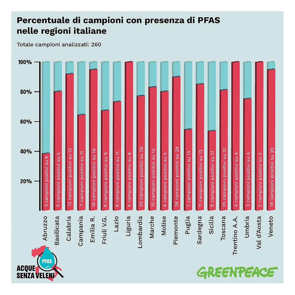 Il viaggio di “Acque senza Veleni” di GreenPeace ha attraversato lo stivale, fiutando ogni goccia di acqua potabile nei comuni d’Italia. Il responso? Una realtà scomoda che grida all’emergenza. Sotto il microscopio, l’acqua di 235 comuni ha rivelato la presenza dei famigerati PFAS – composti chimici quasi indistruttibili, già etichettati come “inquinanti eterni”. Dalle fontane di paese alle metropoli, il cocktail invisibile è stato trovato nel 79% dei campioni.